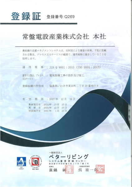 | 2001年 1月 | ISO 9001 認証取得 電気設備工事の設計及び施工(ISO取得対象事業所は本社のみ) |